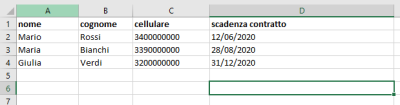 - Esportare dal gestionale o preparare tu stesso un file excel in cui inserisci nome, cognome, numero di cellulare e data di scadenza contratto (più altre eventuali informazioni)