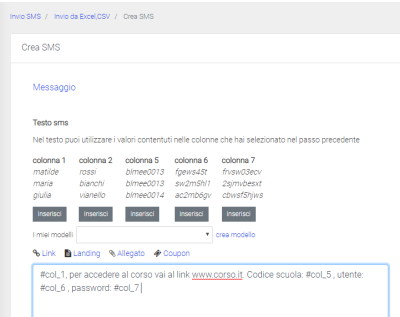 - Comporre il testo dell’SMS usando i “segnaposto” relativi alle colonne.