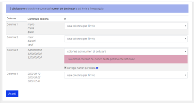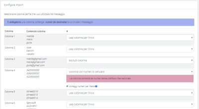 - Configurare l’import indicando quali colonne devono essere utilizzate per l’invio.