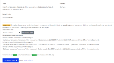 - Nella schermata riassuntiva ci sono degli esempi di SMS che verranno inviati. Come vedi nello screenshot qui sotto, i “segnaposti” nell’SMS verranno automaticamente sostituiti con il dato corretto di ogni singolo docente presente nel file excel.