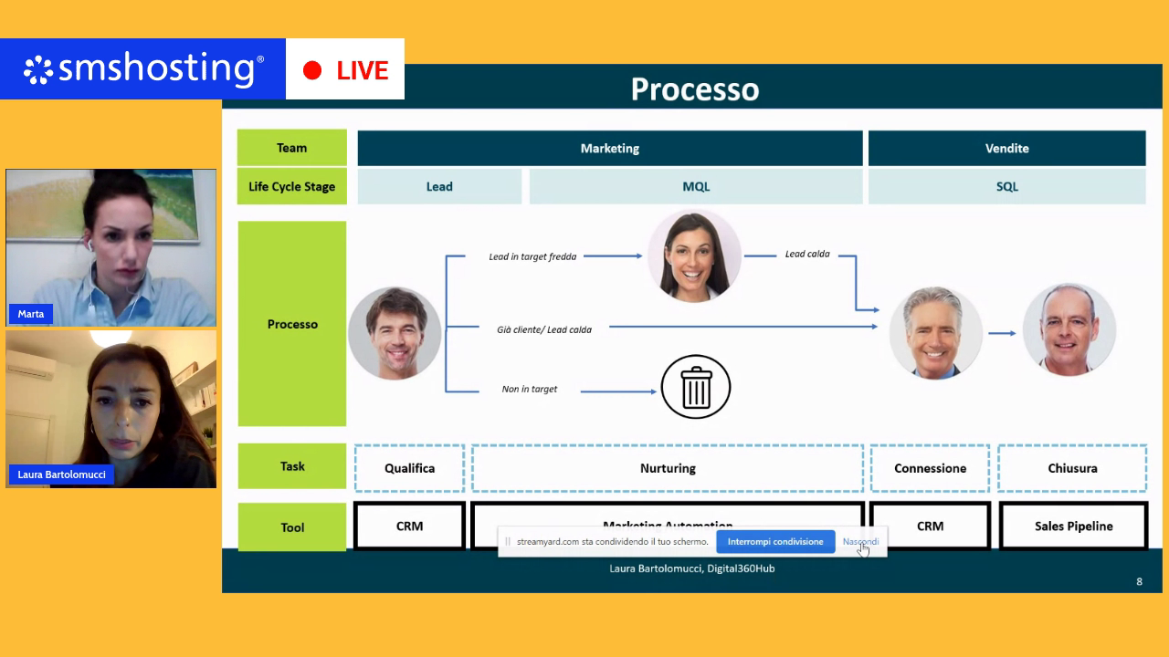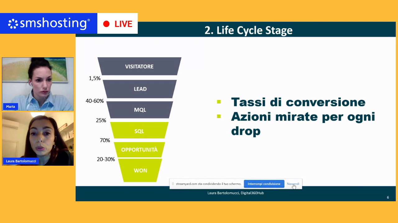 Laura: Abbiamo visto come il funnel è colorato in due modi diversi perché dal passaggio da contatto a contratto devono intervenire il marketing, ma anche il team sales.