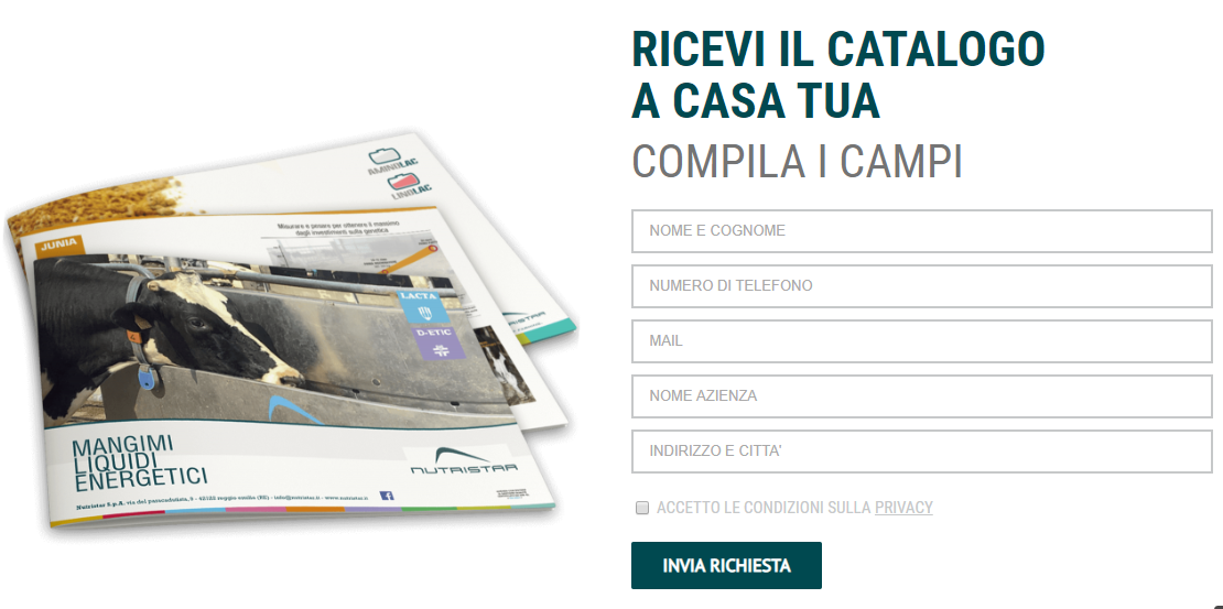 catalogo prodotti: se hai un buon numero di prodotti, sono moltissime le aziende che rendono disponibile il loro catalogo come lead magnet. E funziona! Ecco l'esempio di un'azienda che produce mangimi: