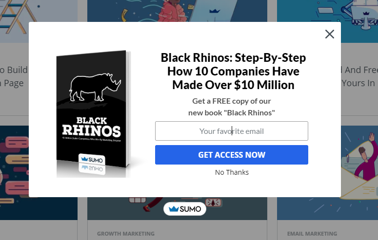 e-book, come questo esempio di "SUMO" che propone all'utente di scaricare la guida su come 10 aziende sono riuscite a fatturare più di 10 milioni di dollari 👇 Si tratta sicuramente di un tema d'appeal per il loro target!