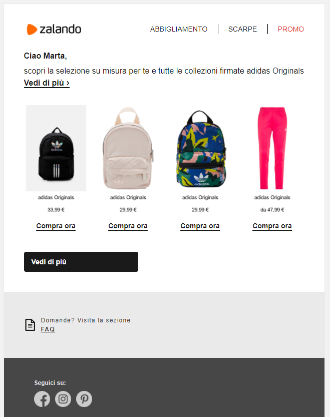 Prendiamo l'esempio di Zalando, e-commerce per l'abbigliamento. In questo caso, dopo che l'utente ha acquistato due prodotti del brand Adidas, riceve questa email:
