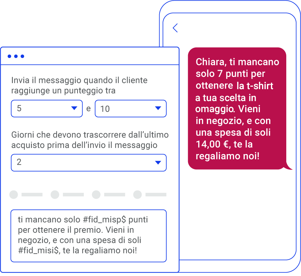 - Stabilisci i premi e i punti necessari per raggiungere il premio. Puoi anche decidere di impostare degli SMS automatici quando al cliente mancano per esempio 5€ di spesa per riscuotere un premio 😍 In questo modo lo stimolerai a tornare in negozio, anche quando magari non ci aveva pensato!