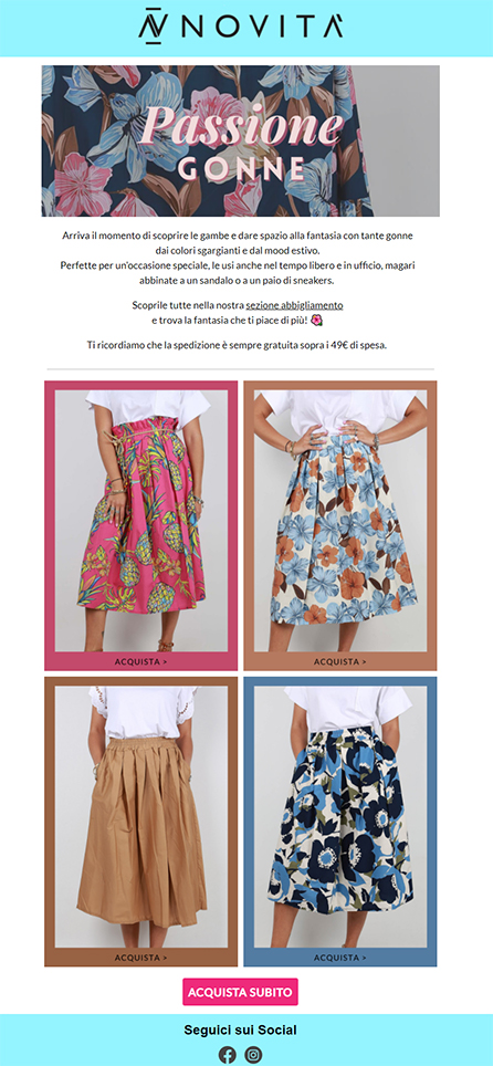 La cosa importante è darsi una cadenza regolare - per esempio una volta a settimana - e rispettarla con costanza. E cosa inviare? Un'idea sempre interessante è mostrare i nuovi arrivi, magari puntando su un capo specifico e le sue varianti, come in questo esempio di Novità sulle gonne 👗: