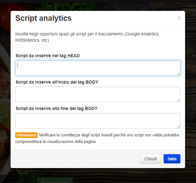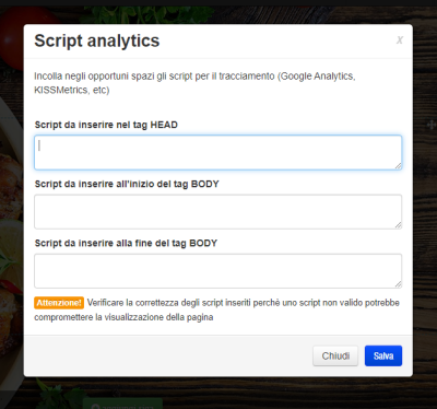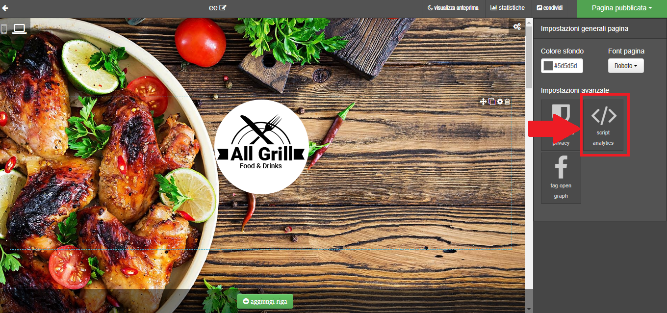 - Ora vai nella landing page e dalla sezione "Impostazioni generali della pagina" clicca su "Script Analytics":