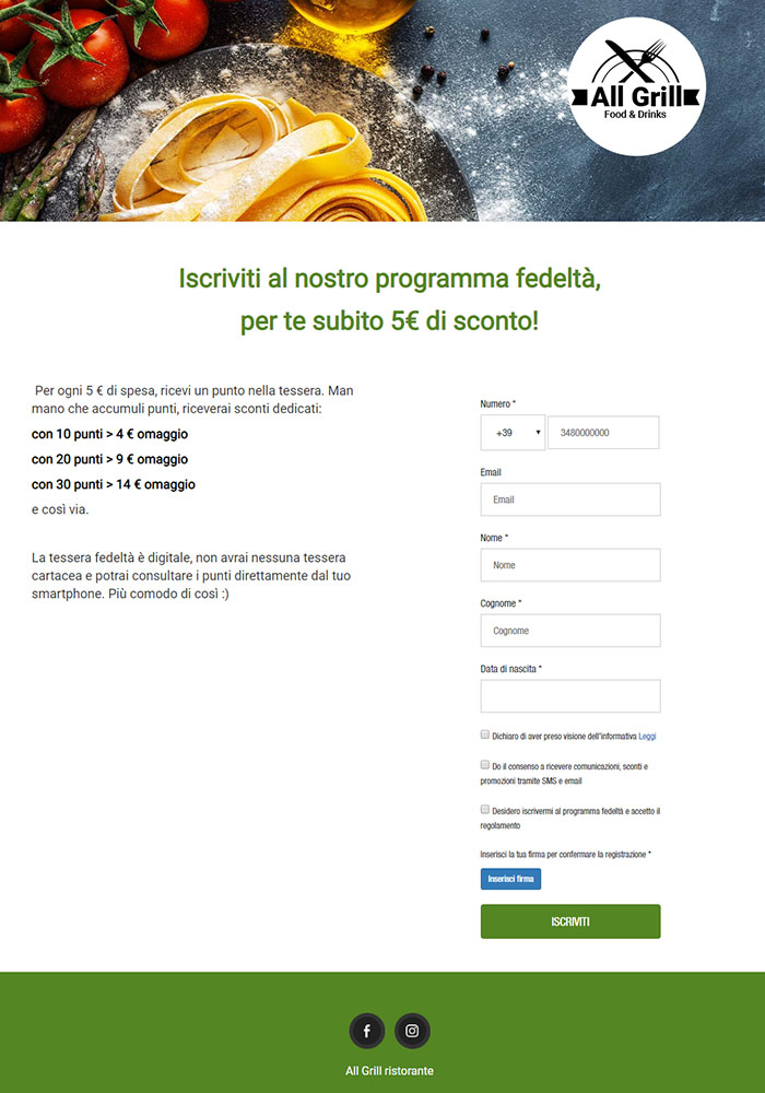 Chi compila il form (incentivato dai 5€ di sconto subito), si iscrive automaticamente al programma fedeltà digitale del locale. Cosa significa?