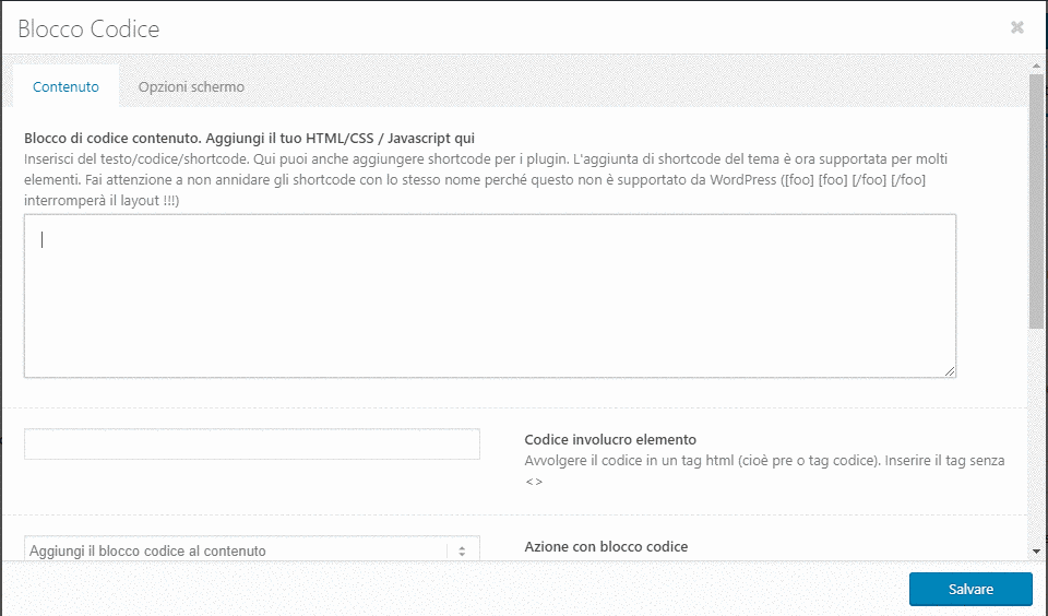 se usi l’editor classico di WordPress, incolla il codice nell’Editore di Testo, selezionando la linguetta "Testo". Negli editor più avanzati, troverai la possibilità di aggiungere un un "Blocco Codice":