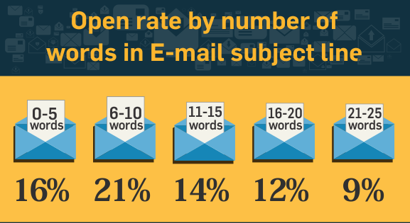 Semplicità, ma anche concisione e brevità. Secondo il report di Invesp la lunghezza "ideale" di un oggetto email è dalle 6 alle 10 parole. Nella seguente immagine puoi vedere come il tasso di apertura medio di un oggetto email con 6-10 parole è pari al 21%, e questa percentuale scende sia al diminuire che all'aumentare del numero di parole :